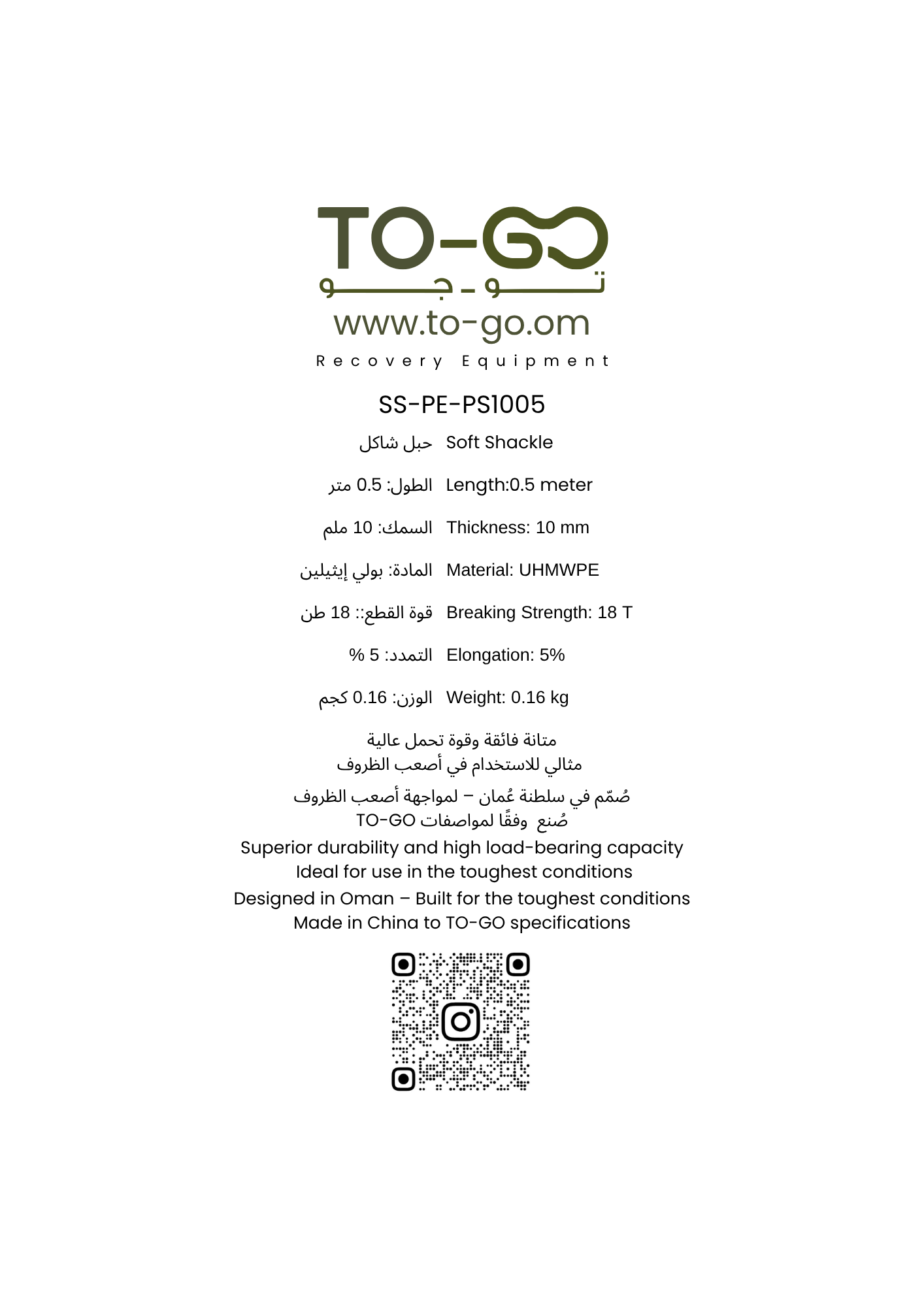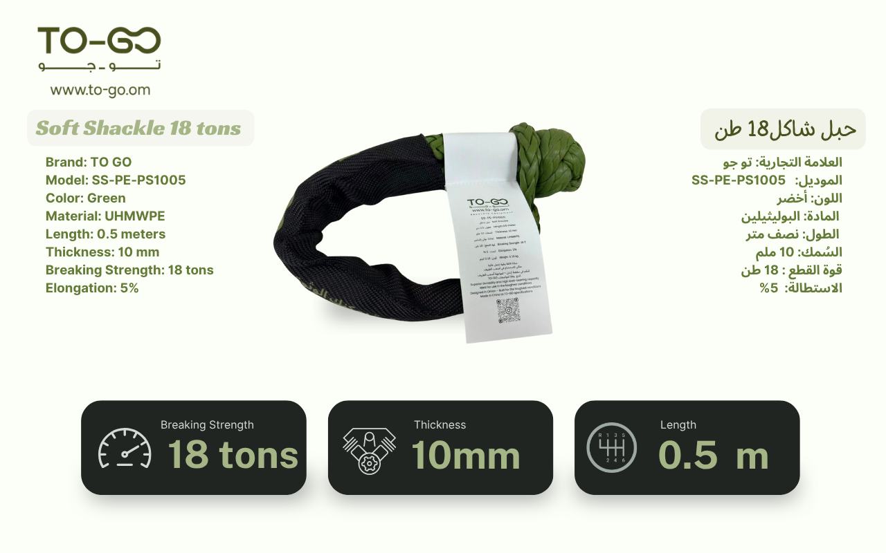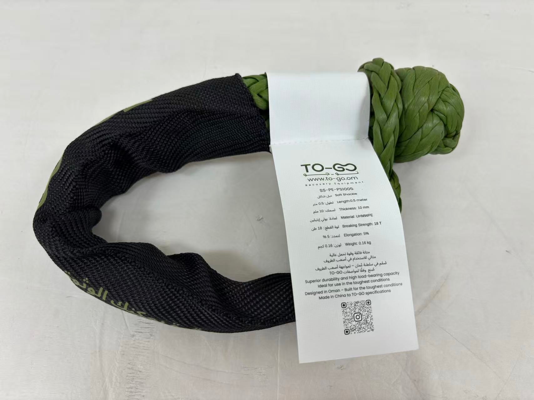 The Soft Shackle 18 Tons (SS-PE-PS1005) is engineered for heavy-duty recovery operations. Made from UHMWPE, it delivers an impressive 18-ton breaking strength while remaining flexible, lightweight, and safe to use. The green rope body combined with a black protective sleeve enhances abrasion resistance and durability in harsh environments.